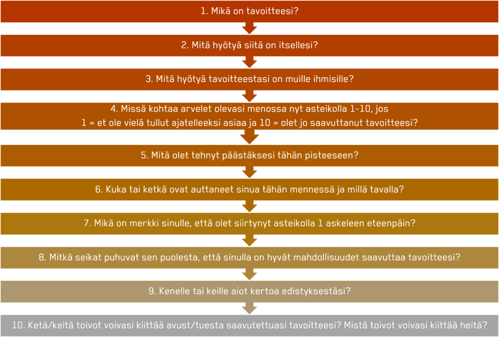 - olet asettanut itse itsellesi tavoitteen ja haluat arvioida sen realistisuutta, esimerkiksi tarvittavaa aikaa ja mahdollisia haasteita,