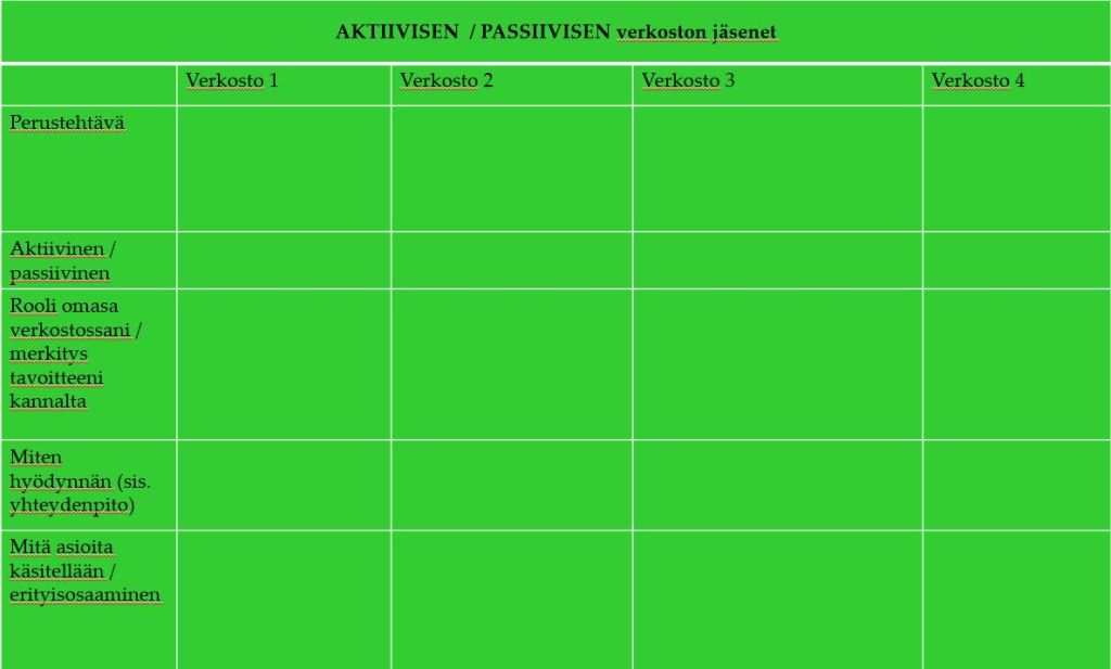 - Millaiset tahot/henkilöt/instanssit auttaisivat sinua tavoitteesi saavuttamisessa? Miten näitä aiot hankkia verkostoosi?